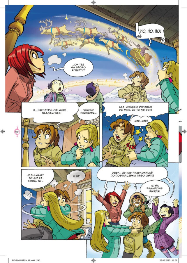Najbardziej widowiskowym rozdziałem jest bez wątpienia Inny świat. Strażniczki trafiają na planetę Nune-Boreal, gdzie wchodzą do magicznego turnieju przeciwko Runicznym, by zdobyć różdżkę Narvala. To czyste fantasy w najlepszym wydaniu: pojedynek pełen akcji, rywalizacji i napięcia, a jednocześnie okazja, by podkreślić wagę rozsądku i przyjaźni nad brutalną siłę. To właśnie tutaj tom nabiera prawdziwego rozmachu, rozbudzając nasz apetyt przed kolejną księgą. Rysownicy błyszczą w dynamicznych kadrach, a scenariusz dostarcza emocji, które długo zostają w pamięci. Na finał dostajemy List pełen marzeń, świąteczną, ciepłą historię, czyli coś, co uwielbiam! Dziewczyny postanawiają doręczyć list na Biegun Północny bez użycia magii. Prosty pomysł, a efekt naprawdę ujmujący, okazuje się bowiem, że nawet w świecie pełnym mocy największą wartość ma zwyczajny gest przyjaźni.