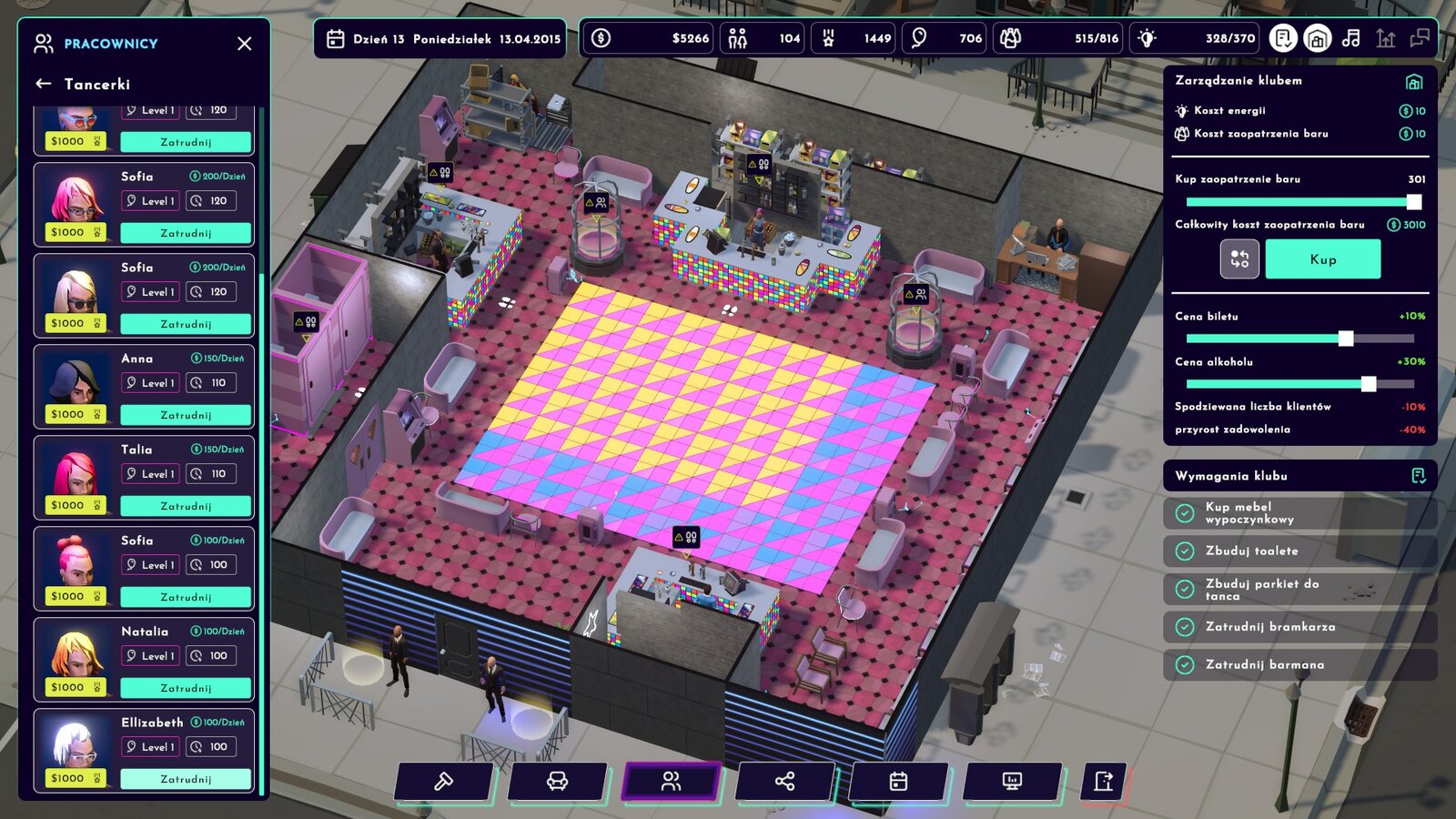 Na koniec pozostało jedynie wybrać nazwę klubu i można działać. Moim pierwszym lokalem w portfolio został Temperatura Music Club. W grze nie ma typowego samouczka, są podpowiedzi, tak więc pierwsza lokalizacja była swoistym poligonem doświadczalnym. Nazwa zobowiązuje, więc wystrój dyskoteki inspirowany był stacją benzynową Skolima. Wcieliłam się w postać Marthy, dzięki czemu miałam większe środki na dekorację klubu. Nie musząc zważać na koszty, postawiłam na samym środku podświetlany parkiet i dwa bary. W ciągu dnia zajmujemy się aranżacją przestrzeni, nadzorowaniem przestrzeni oraz zatrudnianiem pracowników.