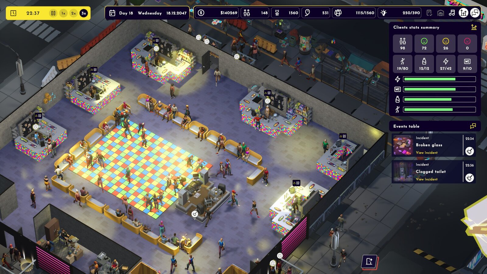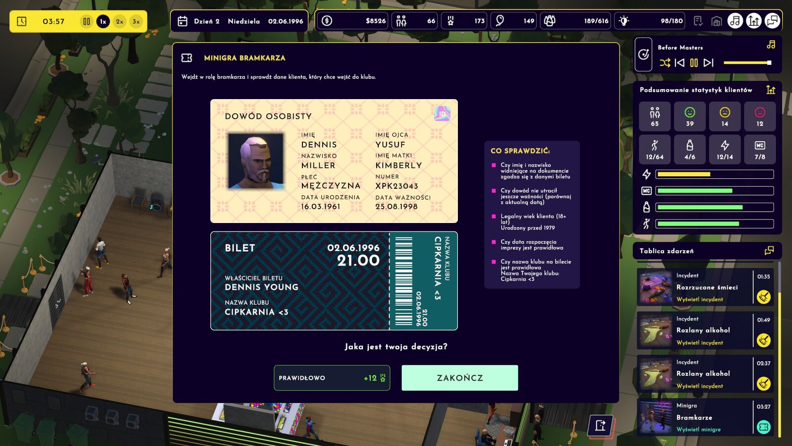 Twórcy kładą nacisk głównie na zarządzanie. Gdy taneczna mekka jest gotowa, zaczynacie nocną zmianę. Klienci szturmują klub od 8 do 20. Twoim zadaniem jest monitorowanie incydentów. Część zadań możesz delegować na pracowników, resztę musisz robić sam. Są to przyjemne i szybkie mini gry, które skutkują zastrzykiem gotówki bądź reputacji. Pierwszą z nich jest stworzenie określonego drinka po wybraniu odpowiednich składników, innym razem musisz sprawdzić dowody podczas selekcji, czy skomponować set didżejski. Goście zasypiający na kanapie w alkoholowym amoku staną się Twoim codziennym krajobrazem. Tak samo awarie, czy bójki. Po kilku godzinach rozgrywki będziesz znał na pamięć każdy kryzys i mógł wybrać rozwiązanie idealnie pod wymaganie danego scenariusza. Z jednej strony to duże ułatwienie, z drugiej czasami miałam poczucie, że jak na strategię poprzeczka przez większość czasu nie była postawiona zbyt wysoko. Dopiero ostatnie misje wymagają sporo farmienia i samozaparcia.