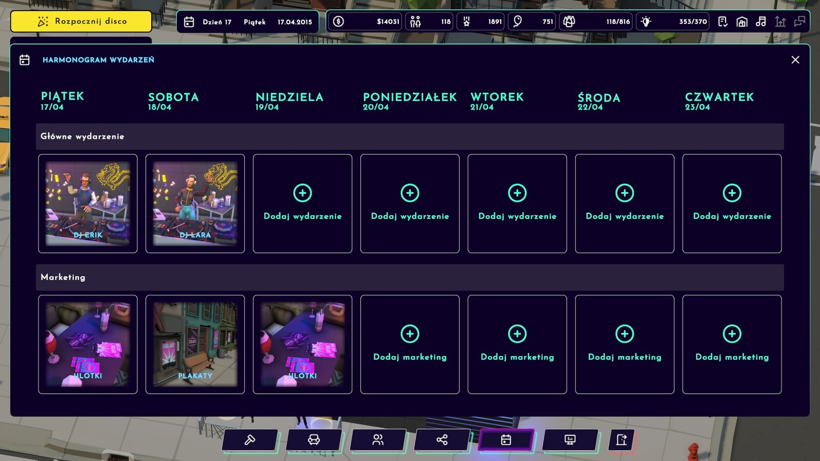 Rozgrywkę rozpoczynamy od wyboru menagera i typu klubu, który chcemy poprowadzić. Każdy z menagerów ma swoje perki – jeden da Ci większy budżet na start, inny ma zniżki na ulepszenia bądź od razu startuje z możliwością organizowania eventów i zapraszania znanych DJ. Każda lokacja ma cel fabuły, który musisz osiągnąć, by móc odblokowywać następne punkty. Jeżeli preferujecie rozgrywkę bez presji, możecie zdecydować się na tryb wolny.
