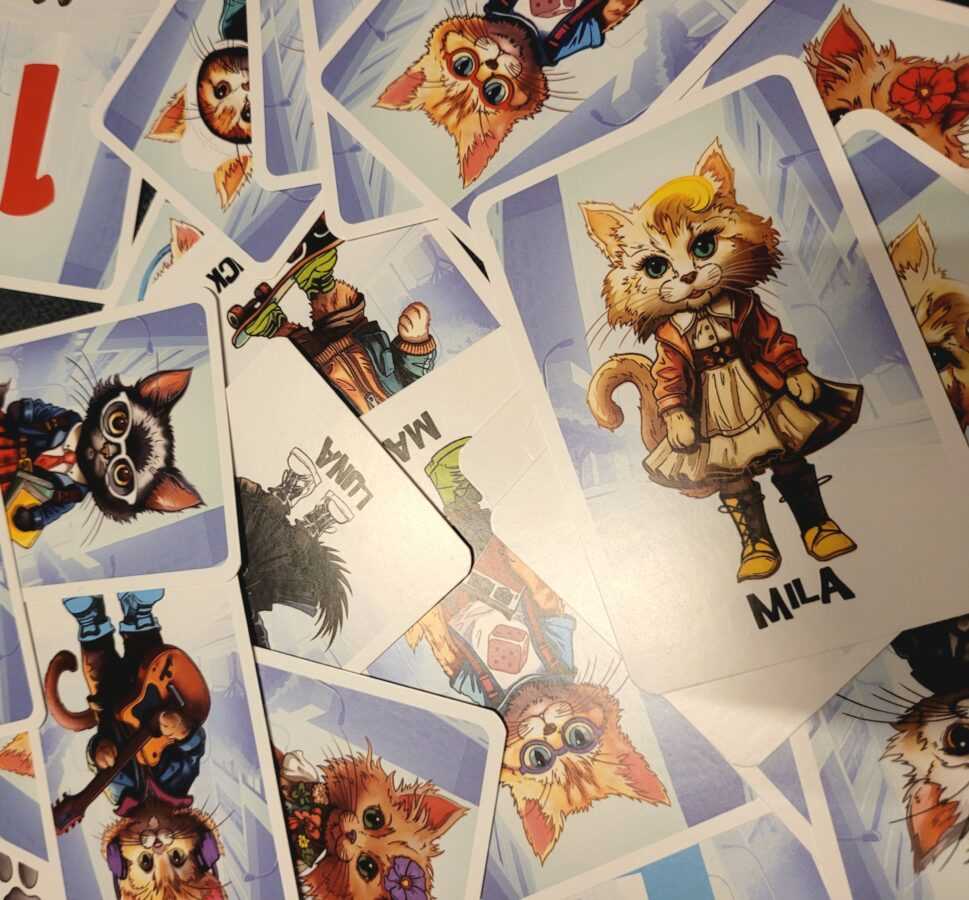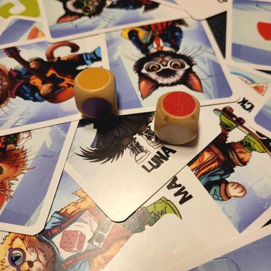 Kolejny aspekt, przez który uważam, że Koty w butach to gra dla młodszych, to grafika. Gra jest słodka, kotki są tak młodzieżowe, że Steve Buscemi mógłby się od nich uczyć. Młodszym graczom ten styl się podobał i bawił ich. Starszym nie przypadł do gustu. Obiektywnie muszę przyznać, że karty są ładne – starannie wykonane, bardzo estetyczne i kolorowe. Barwy innych części garderoby nie odwracają uwagi od kluczowych elementów, przez co gra jest czytelna. Kości są solidne, drewniane, a nie plastikowe, co – jak dla mnie – zawsze jest in plus.