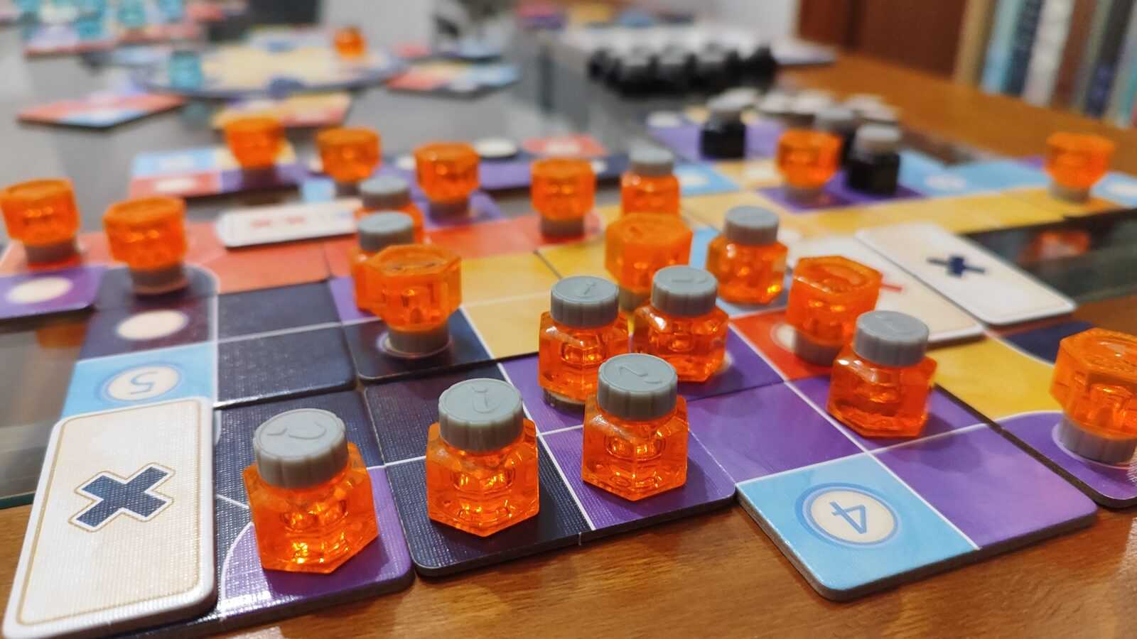 Same kałamarze prezentują się przepięknie – małe akrylowe buteleczki wyglądają świetnie. Uważam jedynie, że można było dobrać bardziej kontrastujące kolory, bo jednak pomarańczowy i czerwony mogą się trochę ze sobą zlewać. Twórcy przewidzieli na szczęście, że ktoś może mieć problemy z rozróżnianiem kolorów i do gry dołączone są znaczniki, jednak wszystkie są okrągłe. Osobiście gdybym decydował się na taki ruch, to wykonałbym je w innych kształtach.