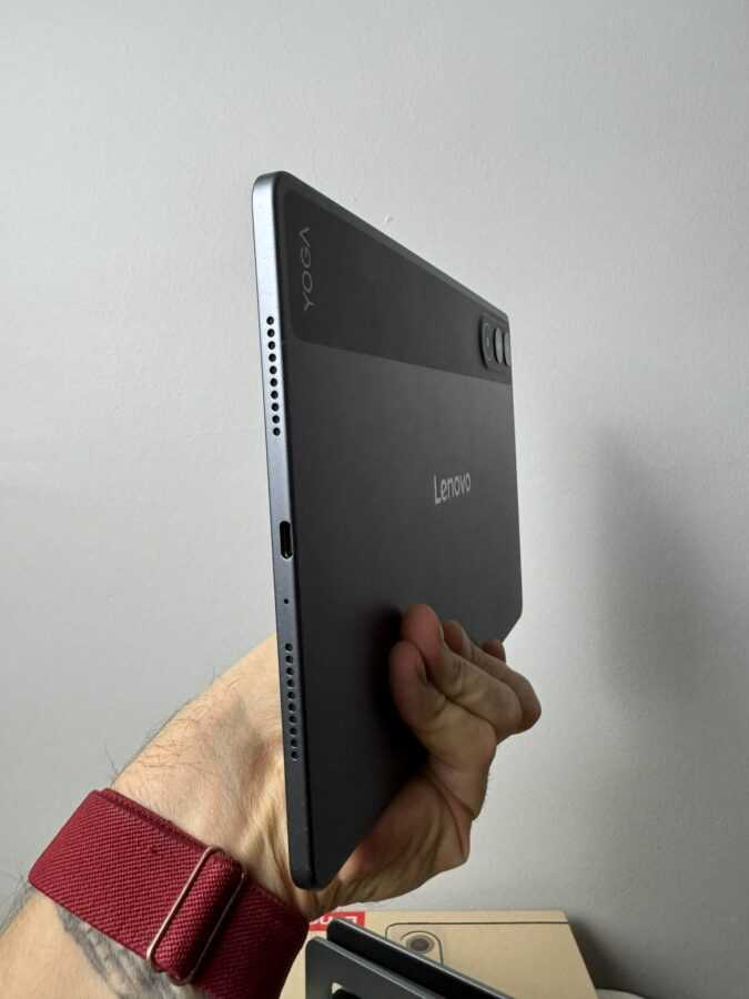 Nie jest on przy tym przesadnie ciężki (waga całkowita to około 450 g) i nie ciąży podczas użytkowania. Wymiary tabletu to 255 × 165 × 6,2 mm. Całość jest bardzo dobrze spasowana – nie uświadczymy tu żadnych luzów ani trzeszczenia podczas użytkowania. Widać, że Lenovo stara się stworzyć produkt wysokiej jakości, który będzie nam służył przez lata w codziennym życiu.