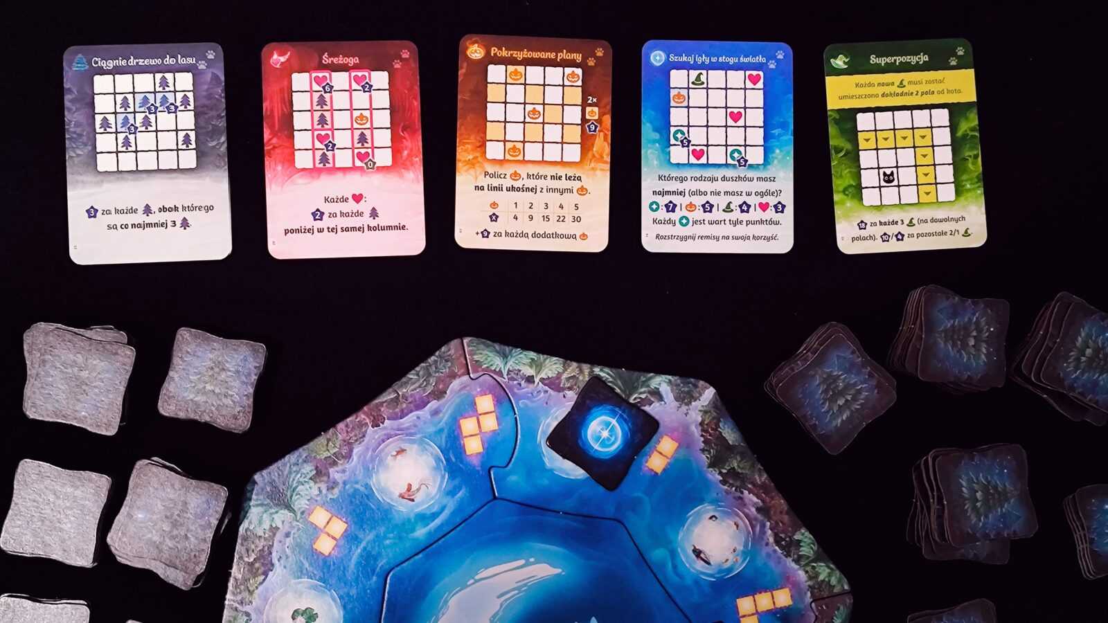 Gdy jeden z graczy wypełni swój las w całości, runda się kończy, podliczamy punkty według kart wyzwań i przechodzimy do kolejnej. Jeśli chcemy, możemy przenieść kota na inny kafelek lasu – zauważyłem, że ten manewr przydaje się przy wypełnianiu wyzwań Wiedźm!