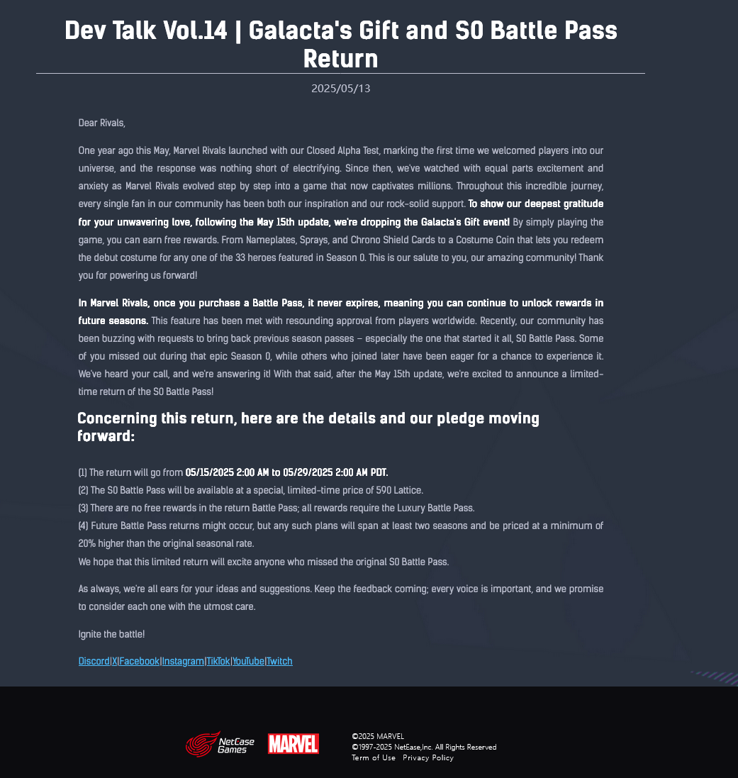 A year ago, Marvel Rivals entered Closed Alpha – and now we're celebrating how far we've come with a special surprise for our community! 🌟 Galacta's Gift is live, and so is the return of the original S0 Battle Pass for a limited time!