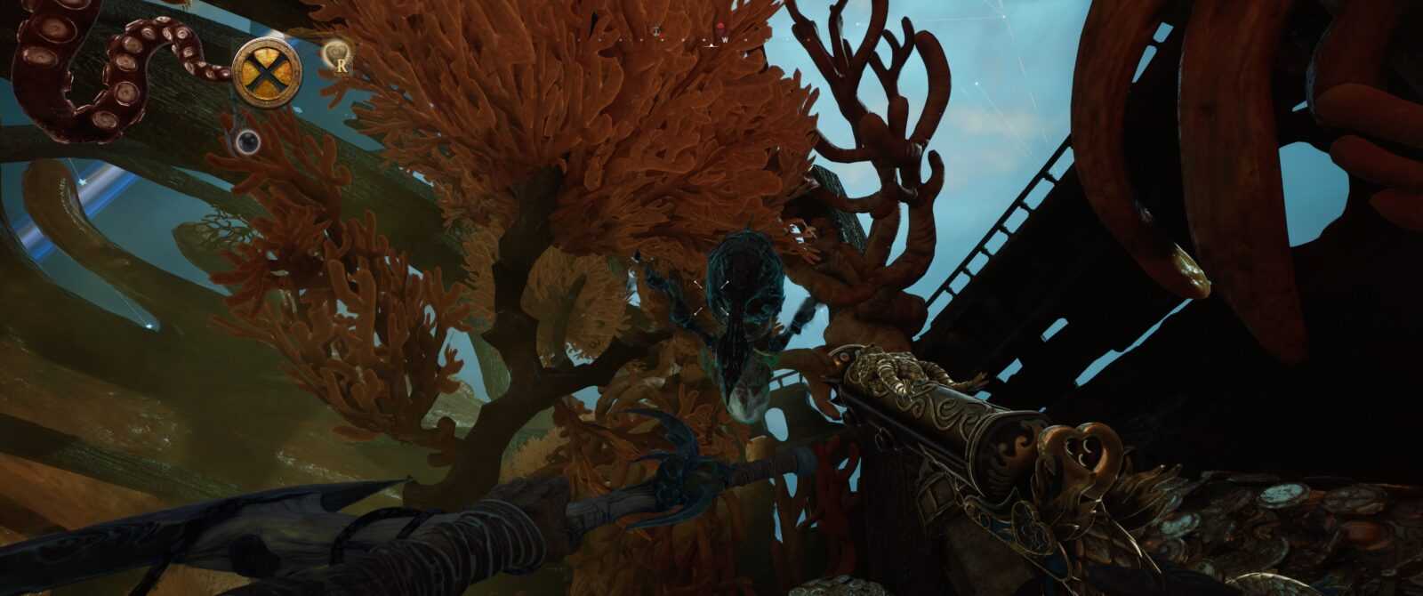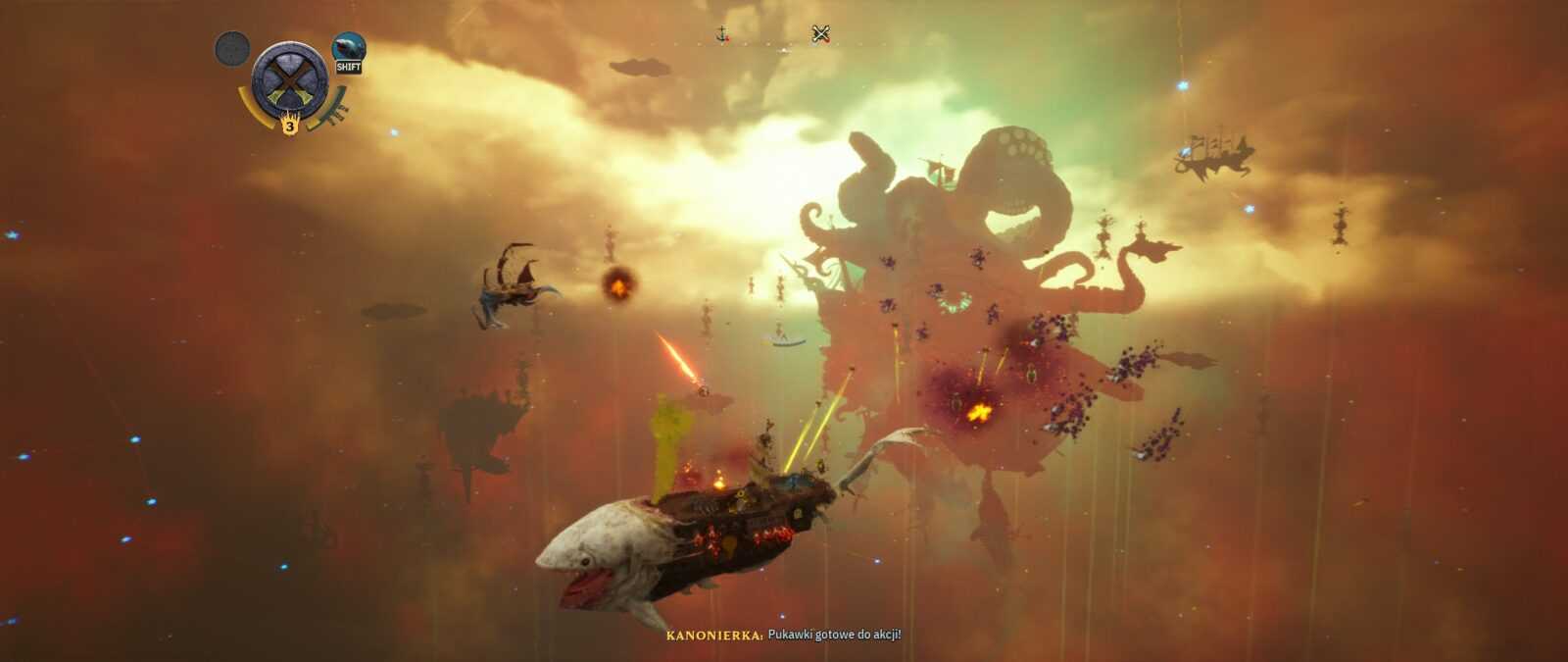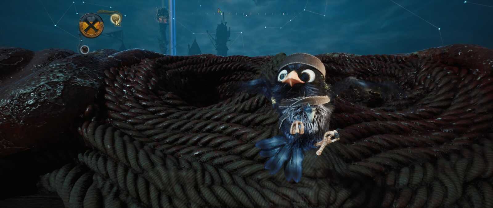 Stylistyka także trafiła w mój gust – czuję tutaj lekką inspirację wizerunkiem Davy’ego Jonesa z Piratów z Karaibów oraz Latającym Holendrem. Wszystko, co widzimy na ekranie, to ciekawa fuzja typowo żeglarskiego ekwipunku połączona z elementami fauny i flory morskiej. Mamy więc statki składające się z kałamarnic czy wielorybów oraz żyjące działa okrętowe, „wyrastające” tu i ówdzie niczym rośliny. Wszystko to sprawia, że kraina The Locker prezentuje się jako żyjący organizm, pełen niespotykanych istot oraz przedmiotów żywcem wyciągniętych z dna morskiego. Samych nawiązań do popkultury także nie brakuje – wyłapałem bezpośrednie odniesienie do chociażby Władcy Pierścieni, a jeden ptak faktycznie przypomina pewnego znanego pirata. Uwielbiam takie smaczki i pożeram je z zawziętością żarłacza białego.