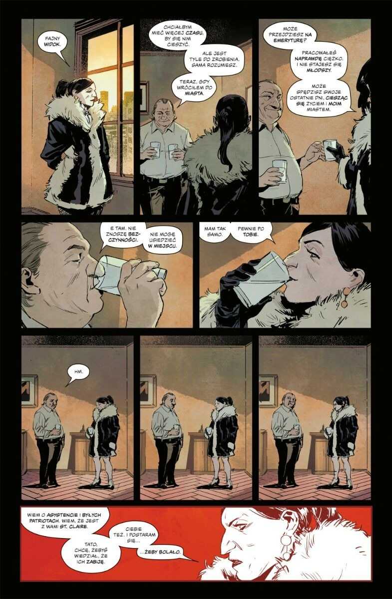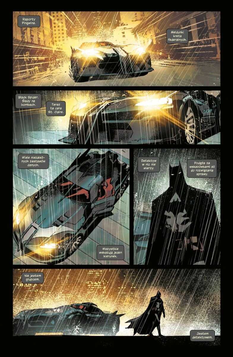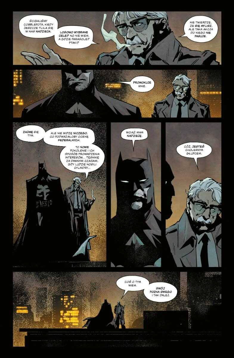 Największym atutem tego tomu jest to, jak King pokazuje Pingwina nie jako karykaturę, ale jako człowieka z jasno określonymi ambicjami i bezwzględną wolą ich realizacji. W tle pojawia się oczywiście Batman, lecz obecność Mrocznego Rycerza jest tu drugorzędna – to historia Oswalda, jego metod i jego nieustannego balansowania na granicy zwycięstwa i upadku. Czytelnik szybko zauważy, że siłą tej serii nie jest tempo akcji, lecz napięcie budowane wokół relacji i decyzji bohatera. To komiks, który uderza bardziej atmosferą niż wydarzeniami.