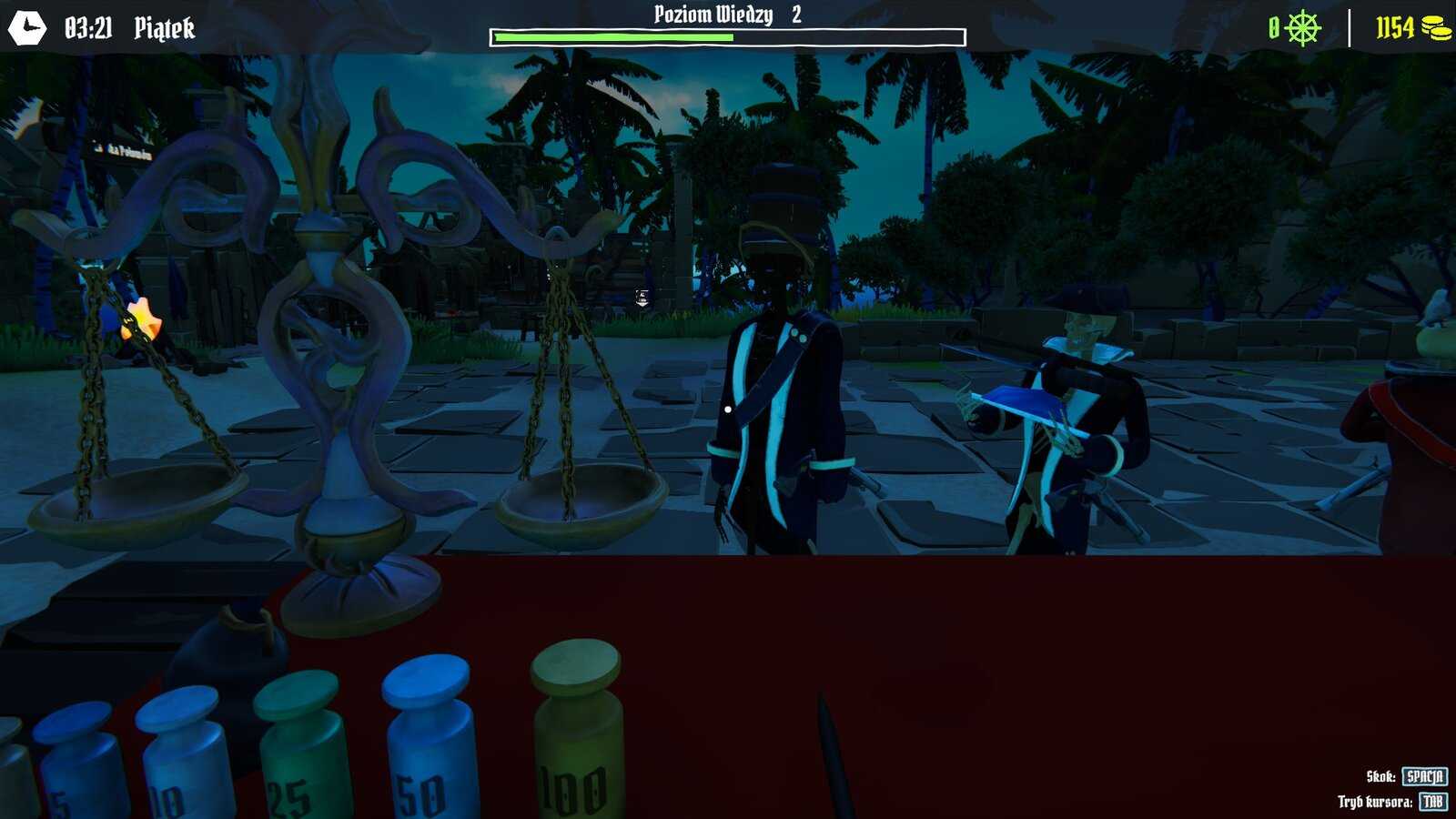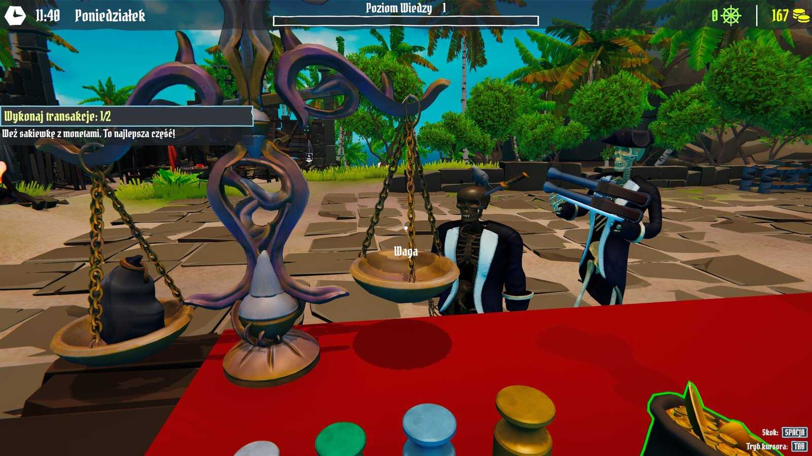 Wracając do naszego sklepiku, tutaj twórcy znów wykazali się kreatywnością. W Alchemist Shop Simulator pieniądze wydawało się klientom przez proste liczydło. W Pirate Cove Simulator ten element został rozwinięty, korzystamy z wagi i odważników by wydać klientowi odpowiednią ilość złota. To pomysł wyjątkowo oryginalny, a przy tym dający sporą satysfakcję, przynajmniej na początku. System ten wymaga dokładności, dodaje immersji i autentycznie sprawia, że czujemy się jak fizyczny sprzedawca. Od razu dopadła mnie nutka nostalgii, bo doskonale pamiętam te stare wagi w sklepach na początku lat 90.