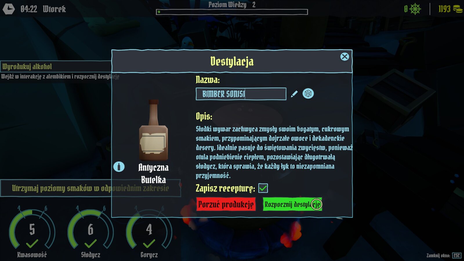 Dzięki temu drugiemu podejściu odkryłam więcej ciekawych elementów. Tuż obok naszego sklepiku znajduje się tajemnicza butelka z magicznymi zleceniami. Każde z nich ma kilka dni na realizację, a zapłata jest naprawdę satysfakcjonująca. Pierwszym z przyjętych i ukończonych zleceń było dostarczenie kilku butelek alkoholu. Eliksir samodzielnie wydestylowałam z zebranych roślin i nazwałam go dumnie Sonisiowym Bimbrem. Otrzymana nagroda pozwoliła mi nie tylko wynająć tragarza, ale też wzbogacić sklepowy magazyn o różnorodne towary, takie jak kufle na złocisty miód czy muszle. Asortyment wzbogaciły również świeżo złowione ryby z mojej morskiej wyprawy.