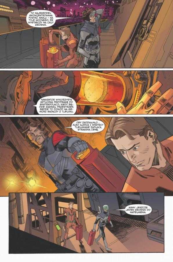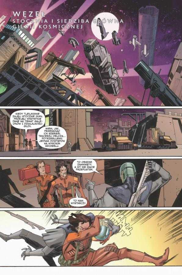 Simone Ragazzoni (rysunki) oraz Dan Jackson (kolory) utrzymują wysoki standard, choć w tym tomie pojawiają się głosy o pewnej nierówności kadrów. Ragazzoni znakomicie radzi sobie z obrazowaniem skali – od monumentalnych liniowców Gildii, po drastyczne sceny w laboratoriach na Ix. Szczególnie uderzające są wizualizacje zbiorników axolotlowych i biomechanicznej technologii Tleilaxan, które wprowadzają do komiksu element body horroru. Kolorystyka Jacksona skutecznie różnicuje klimat poszczególnych planet: od sterylnych pałaców, przez mroczne laboratoria, po piaszczyste pustynie Arrakis.