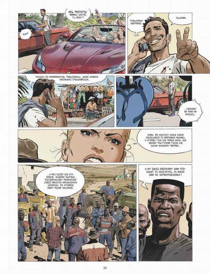 Punktem wyjścia fabuły jest zaginięcie noworodka oraz brutalna śmierć ciemnoskórego robotnika rolnego na farmie białej rodziny. Te wydarzenia uruchamiają lawinę pytań, podejrzeń i wzajemnych oskarżeń. Komiks bardzo sprawnie pokazuje, że w RPA żadna zbrodnia nie jest „tylko” kryminalna – każda natychmiast staje się częścią większego konfliktu. Twórcy unikają prostych odpowiedzi, zamiast tego konfrontując czytelnika z gęstą siecią zależności między rasą, pochodzeniem, władzą i historią.