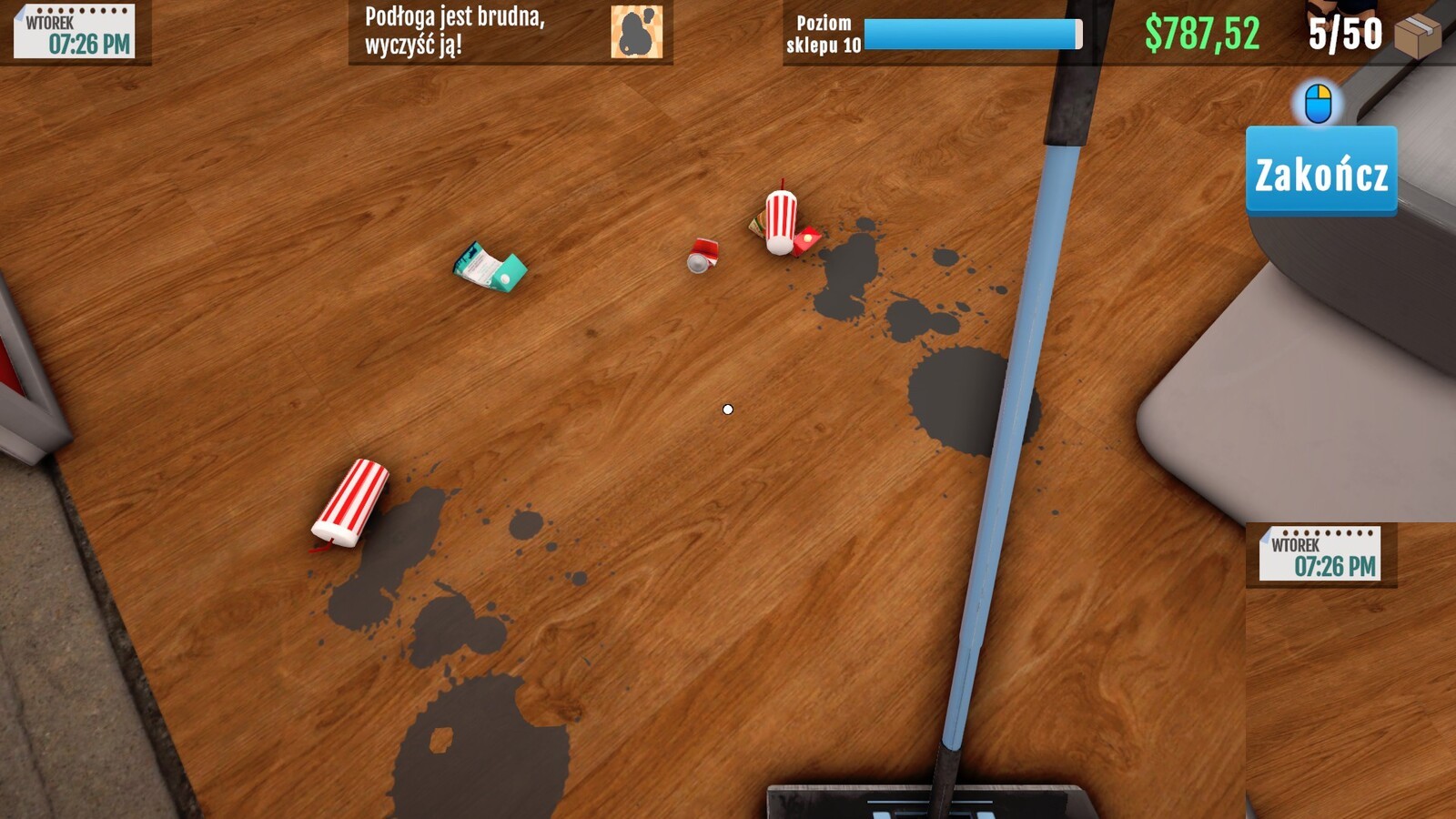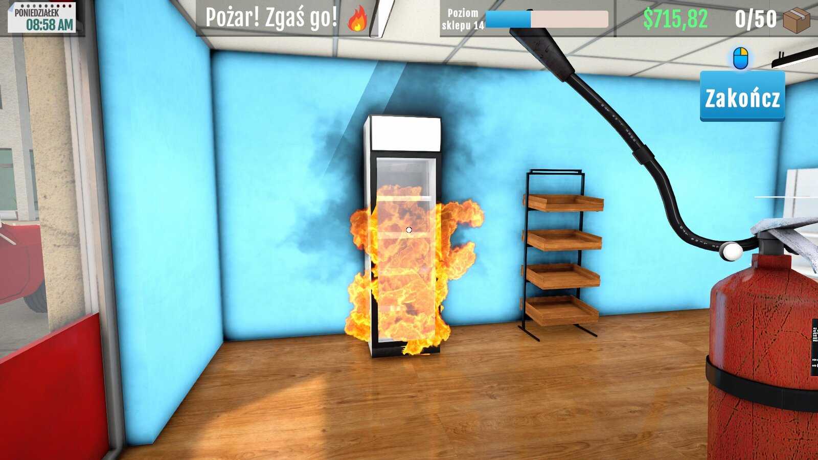 Utrzymanie sklepu w czystości to kolejny obowiązek gracza. Klienci potrafią zostawić śmieci, a brudna podłoga obniża poziom zadowolenia odwiedzających. Niezbędne więc staje się regularne używanie mopa i dbałość o porządek. Największym zaskoczeniem jest jednak mechanika… pożarów. Tak, lodówki i zamrażarki mogą stanąć w ogniu, a Ty jako sprzedawca musisz je ugasić za pomocą gaśnicy. To nietypowe wyzwanie dodaje dynamiki i poczucia odpowiedzialności za bezpieczeństwo sklepu. Warto mieć zawsze zapas mopów i gaśnic, bo nie wiadomo, kiedy będą potrzebne, a szybka interwencja jest zawsze w cenie.