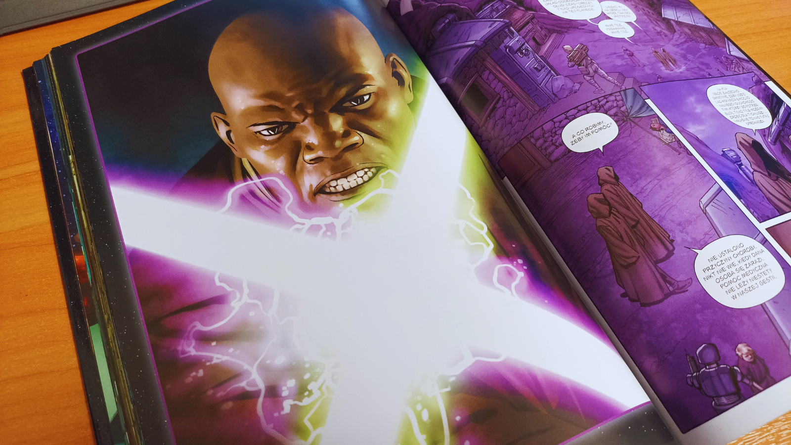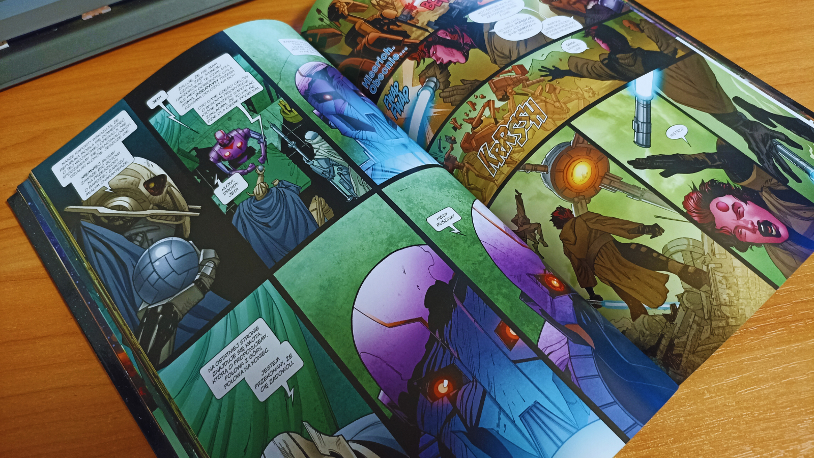 Naprawdę lubię szatę graficzną w komiksach z uniwersum Gwiezdnych Wojen, które przyszło mi w ostatnich latach czytać. Nie mogę jednak przejść obojętnie obok dużego mankamentu tego tytułu. W oczy rzuca się momentami dramatyczne przedstawienie postaci, a zwłaszcza ich twarzy. Owszem, rozumiem, że każde medium rządzi się swoimi prawami, jednak w tym przypadku trudno zauważyć jakiekolwiek podobieństwo do innych dzieł związanych z odległą galaktyką. Zdecydowanie utrudnia to odbiór dzieła. Z drugiej strony mamy jednak dobrze odwzorowane miejsca, pojazdy czy roboty znane z innych odsłon. Dobór barw, dokładnie oddane rękojeści mieczy świetlnych czy charakterystyczne smugi związane z ruchem ich ostrzy tworzą całkiem satysfakcjonujący efekt, przyciągający wielu czytelników.