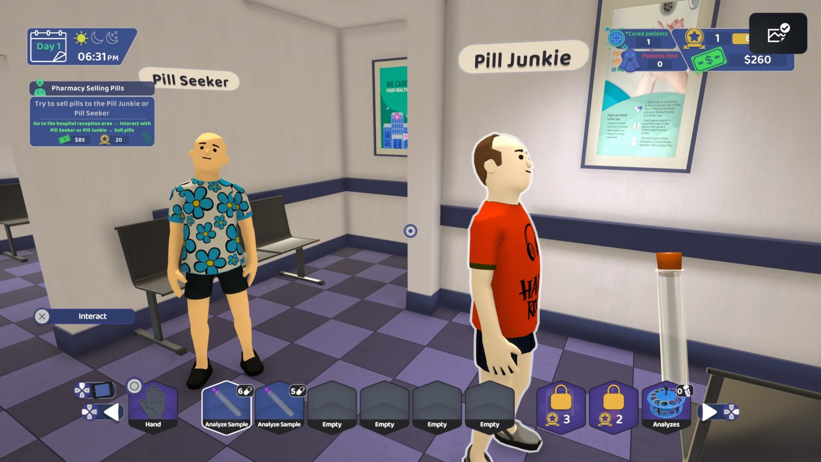 W Two Hands Hospital Assistant Simulator wcielamy się w pielęgniarza, który jest odpowiedzialny za kwalifikację pacjentów na oddział. Przyjęcia bądź odrzucenia dokonuje na podstawie karty zdrowia, na której mamy temperaturę, kondycję fizyczną i ewentualne objawy bądź wskazania do dalszej diagnostyki. To my decydujemy również o kolejności przyjęć i ewentualnych priorytetach. W zakamarkach recepcji mogą również czaić się szemrani panowie, oferujący dobrą cenę za sprzedaż leków na czarnym rynku. Wchodząc w ten biznes, kładziesz na szali reputację placówki. Jeżeli ustalisz zbyt wysoką cenę, niedoszły klient nie omieszka poinformować cię o tym, że doniesie na ciebie do odpowiednich organów. Stwierdziłam, że to mało intratny biznes. Kilka razy sprzedałam leki w ramach questów, które gra podsuwa nam co jakiś czas. Dzięki temu dostałam zastrzyk gotówki, który mogłam przeznaczyć na zakup kolejnych zasobów i modernizację kliniki.