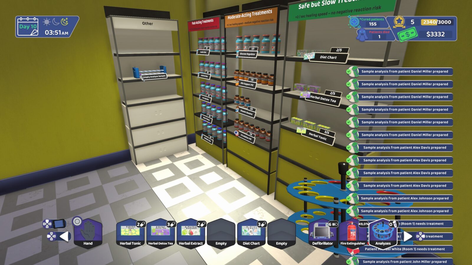 Czasami jednak statystyki zawodzą i nasz podopieczny znajduje się w śmiertelnym niebezpieczeństwie. Albo znajdziemy odpowiedni lek albo jego parametry życiowe zaczną gwałtownie spadać – trzeba więc działać szybko! Za pierwszym razem spanikowałam i nie wiedziałam co mam robić. W najśmielszych marzeniach nie przypuszczałabym, że do zwalczenia wysokiej gorączki potrzebna jest gaśnica proszkowa. I tak oto zmarł Robert Garcia. Mój jedyny utracony pacjent. Po jego odejściu uruchomiłam mechanizm adaptacyjny, tłumacząc sobie, że chociaż pierwszy zmarły na dyżurze to trauma, to od teraz będzie tylko łatwiej zarządzać moimi emocjami. Wszystko po to, by być jak najbardziej pomocnym i profesjonalnym asystentem w Sonisia Medical. Tak, bywa mi smutno, gdy coś się dzieje NPC w grze.