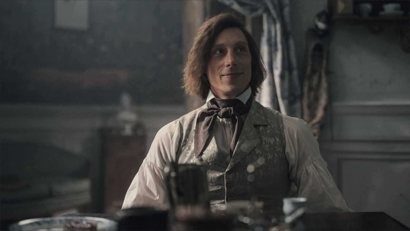 Dzieło Michała Kwiecińskiego to produkcja, którą można uznać za próbę stworzenia artystycznego portretu wybitnego kompozytora, jednak niestety zbyt mocno skupia się on na jednym aspekcie jego życia, czyli chorobie. Zamiast ukazać Chopina jako pełnowymiarową postać, twórcy koncentrują się niemal wyłącznie na jego fizycznym cierpieniu i walce z gruźlicą. Problemy zdrowotne stają się głównym tematem opowieści, spychając na drugi plan wszystko to, co mogłoby przybliżyć nam jego charakter, emocje, pasję i wewnętrzne rozterki. W efekcie tytuł nie tyle opowiada o Chopinie, co o jego przypadłości, przez co zatraca się istota tej niezwykłej postaci. Początkowo sposób narracji wydaje się interesujący. Film operuje rytmem, w którym przeplatają się bardziej dynamiczne, rozrywkowe momenty z tymi pokazującymi pogarszający się stan zdrowia artysty. Jednak z czasem ten schemat zaczyna się powtarzać. To, co na początku jest świeże i intrygujące, po pewnym czasie staje się przewidywalne i nużące. Kolejne fragmenty opowieści wyglądają podobnie, a cykl powtarza się wielokrotnie, przez co produkcja traci napięcie, a emocje widza stopniowo wygasają.